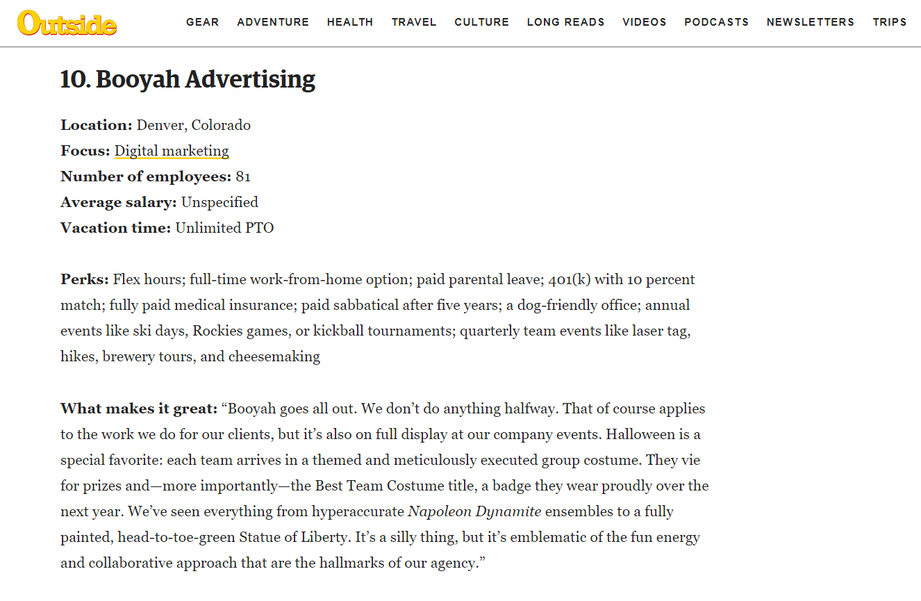 For the second year running, Booyah has been named to Outside‘s 50 Best Places to Work list. Securing the #10 spot on the overall list and the #2 spot in the Medium Employer category (50-249 employees), the agency is proud to have its longstanding commitment to company culture recognized.