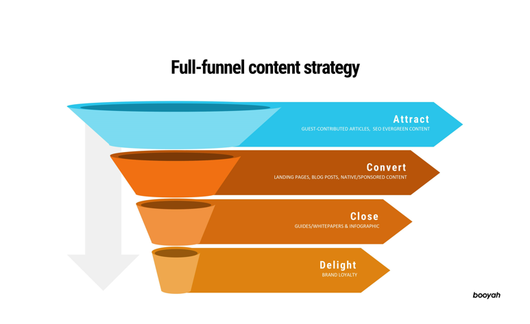 Here at Booyah, we visualize the content marketing funnel in four stages. Each stage plays a crucial role in establishing a relationship with your consumers and should not be overlooked. Here’s an example of how we might set up a content marketing funnel: